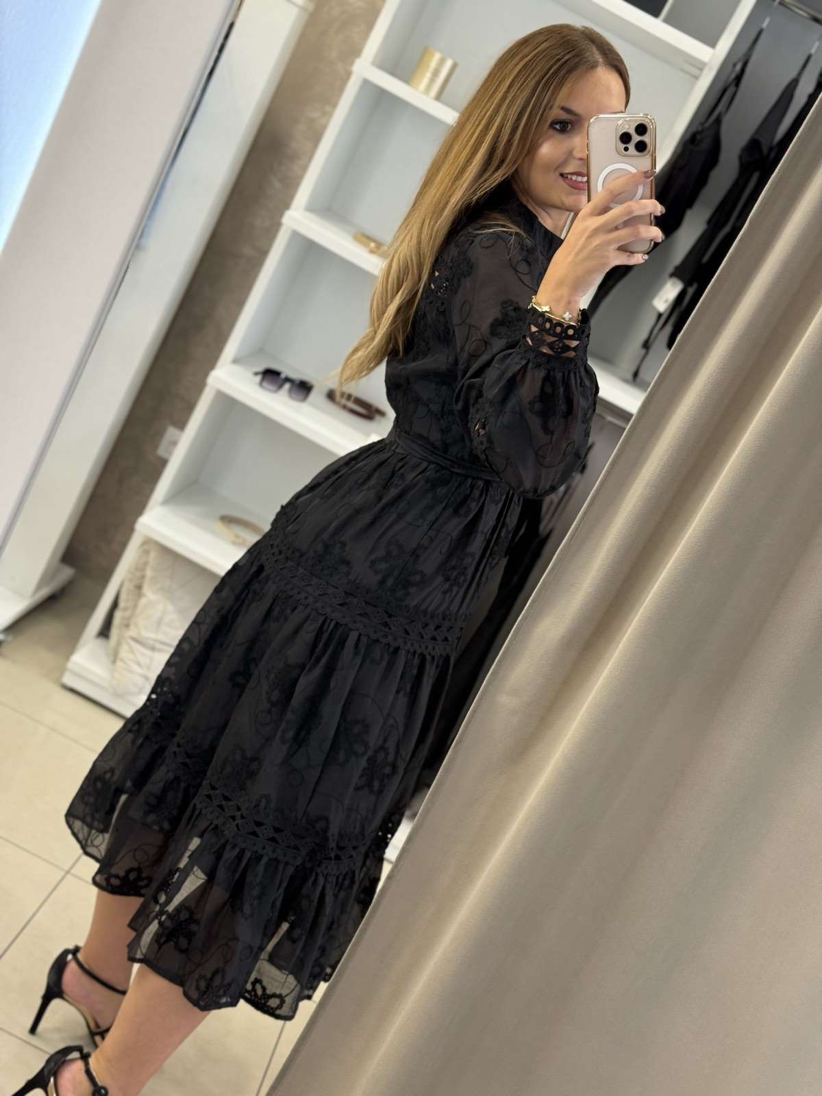 - Midi φόρεμα με βολάν και διάτρητες λεπτομέρειες